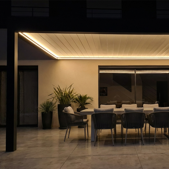 Intégré de manière périphérique directement dans la structure, l’éclairage crée une lumière douce, continue et parfaitement homogène, sans zones d’ombre ni éblouissement. Il transforme la pergola en un véritable espace de vie extérieur, utilisable bien au-delà du coucher du soleil.